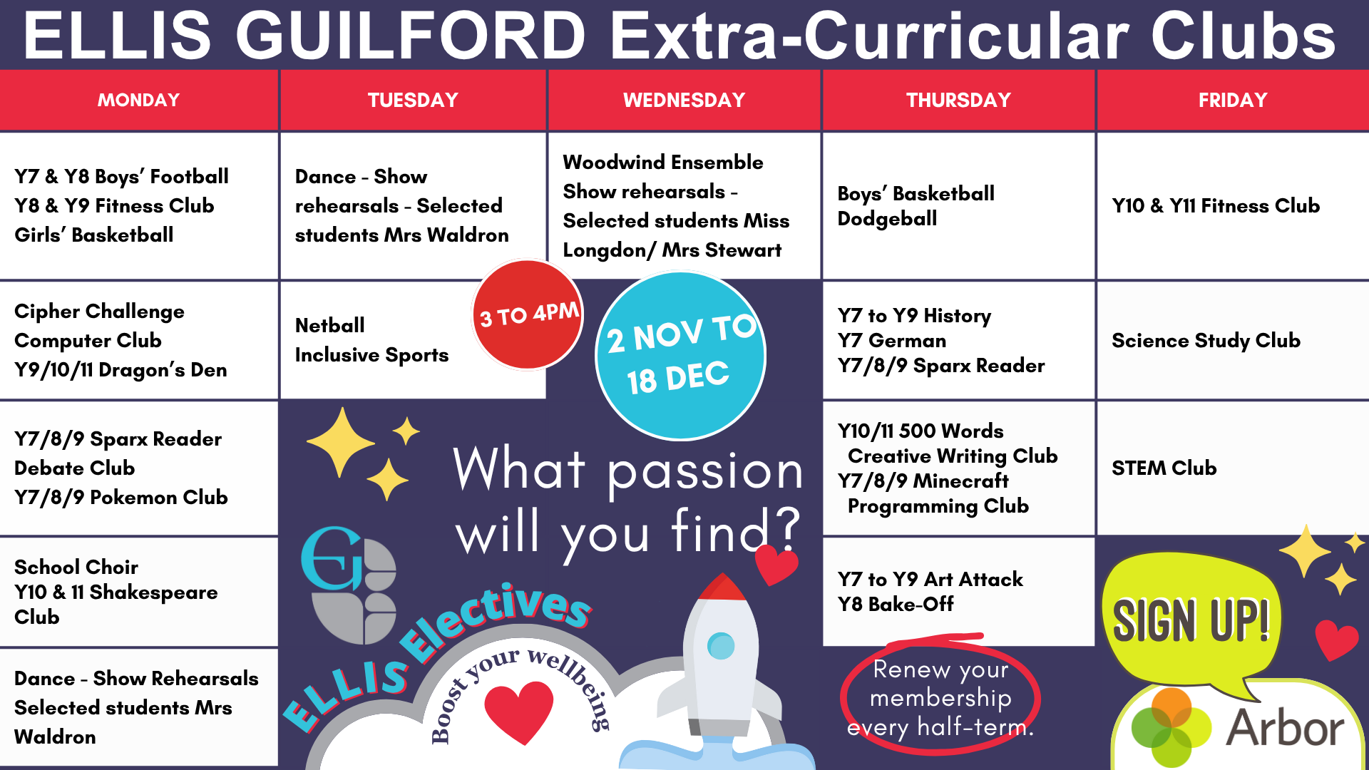 After-School Electives run between 3.00pm and 4.00pm. Sign-up is required through the Arbor Parent App before your child attends any Elective (look for Clubs in the Activities section on the Arbor dashboard).